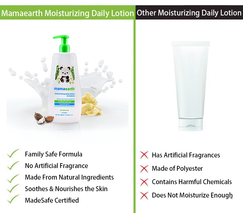 Hi, I’m Mamaearth Moisturizing Daily Lotion for Babies. I understand that your baby needs to be moisturized daily to remain soft and nourished. I help to keep your little one’s skin velvety smooth and healthy for up to 12 hours! I consist of ingredients like Cocoa & Shea Butter that help to moisturize and nourish their delicate skin. Jojoba Oil aids in making your baby’s skin soft and supple while Vitamin E and Aloe Vera help provide relief from the heat of the Sun. You can always trust me for your baby’s needs as I’m made with the best of ingredients from nature. I’m completely free from harmful chemicals like Parabens, Phthalates, PEG, Mineral Oil, and even Artificial Fragrances and come with MadeSafe Certification.