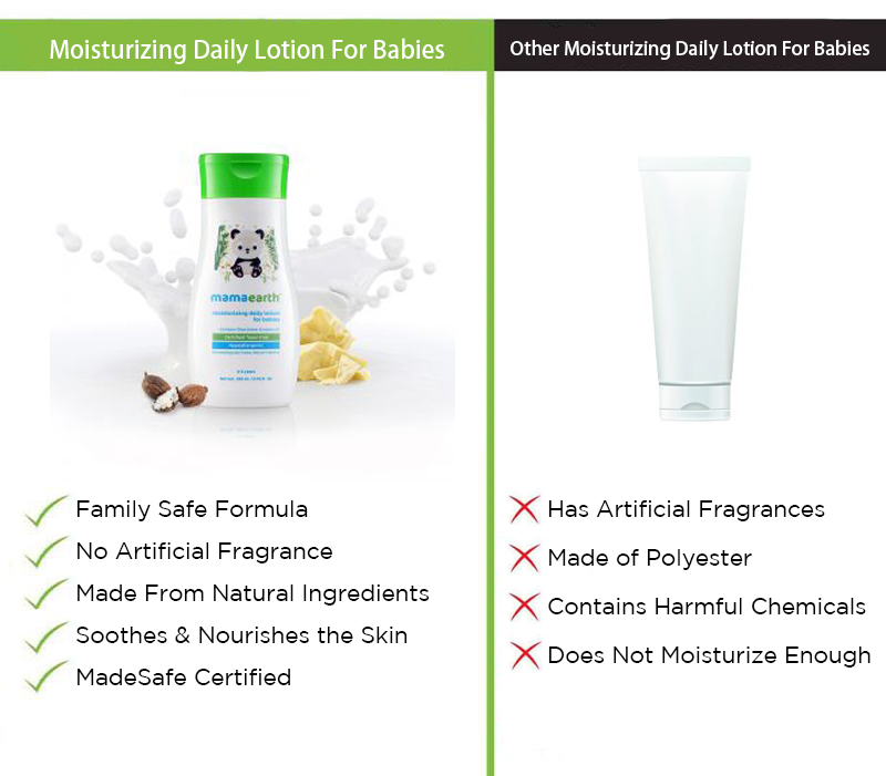 Hi, I’m Mamaearth Moisturizing Daily Lotion for Babies. I understand that your baby needs to be moisturized daily to remain soft and nourished. I help to keep your little one’s skin velvety smooth and healthy for up to 12 hours! I consist of ingredients like Cocoa & Shea Butter that help to moisturize and nourish their delicate skin. Jojoba Oil aids in making your baby’s skin soft and supple while Vitamin E and Aloe Vera help provide relief from the heat of the Sun. You can always trust me for your baby’s needs as I’m made with the best of ingredients from nature. I’m completely free from harmful chemicals like Parabens, Phthalates, PEG, Mineral Oil, and even Artificial Fragrances and come with MadeSafe Certification.
