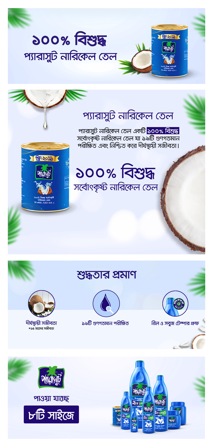 Parachute Coconut Oil is available in different sizes and containers which are –