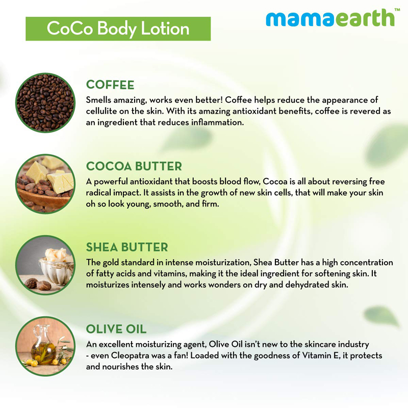 Yes, it is excellent for the body. A safe and natural Cocoa Butter Lotion contains antioxidants that boost blood flow and cellular regrowth in the skin. If it also comes enriched with coffee extracts, the composition would reduce inflammation and brighten the skin. We recommend using Mamaearth’s cocoa butter lotion because it features all these natural ingredients.