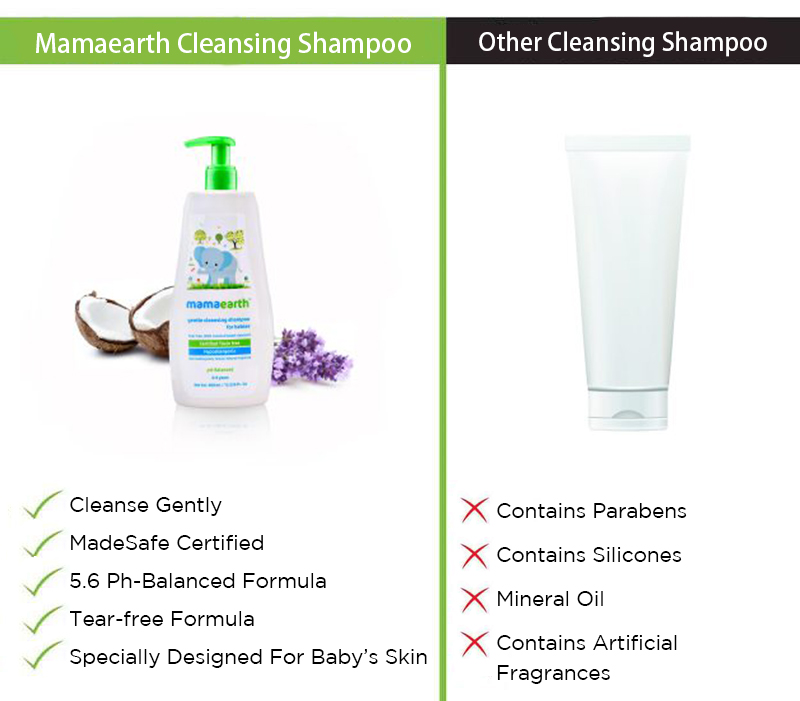 Hi! I am Mamaearth Gentle Cleansing Shampoo. I understand that shampooing is not an easy task and involves effort in real cleaning. I also understand that little ones are quite uncomfortable in getting a head bath and the shampoo has to be quick and efficient. That’s why I am here! Let your baby enjoy my thick, soft and instant foam while I gently cleanse hair and scalp. My 100% toxin-free formula gives your baby soft and nourished hair. I take special care not to irritate those sensitive eyes and be gentle on skin. I am also free from harmful chemicals like SLS, Parabens, Sulfates, and other such chemicals, ensuring a safe and happy bath time. Also, I come with MadeSafe Certification.