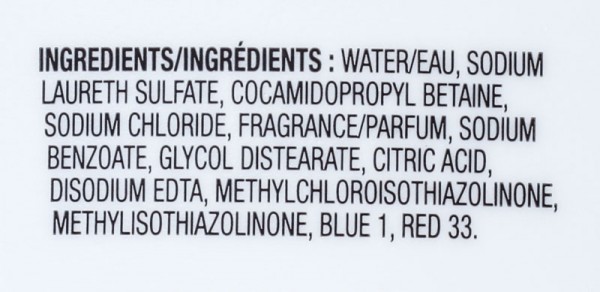 WATER, SODIUM LAURETH SULFATE, COCAMIDOPROPYL BETAINE, SODIUM CHLORIDE, FRAGRANCE, NIACINAMIDE*, PANTHENOL, SODIUM CITRATE, SODIUM XYLENESULFONATE, SODIUM BENZOATE, GLYCOL DISTEARATE, CITRIC ACID, DISODIUM EDTA, METHYLCHLOROISOTHIAZOLINONE, METHYLISOTHIAZOLINONE, BLUE 1, RED 33