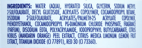 Water (Aqua), Hydrated Silica, Sodium Methyl 2-Sulfolaurate, Glycerin, Decyl Glucoside, Acrylates/Palmeth-25 Acrylate Copolymer, Acrylates Copolymer, Cocamidopropyl Betaine, Disodium 2-Sulfolaurate, Cocamidopropyl Pg-Dimonium Chloride Phosphate, Fragrance (Parfum), Disodium Edta, Ppg-2 Methyl Ether, Phenethyl Alcohol, Polyacrylamide, Methylisothiazolinone, Citrus Medica Limonum (Lemon) Fruit Extract, Citrus Nobilis (Mandarin Orange) Peel Extract, Red 30 (Ci 73360), Titanium Dioxide (Ci 77891).